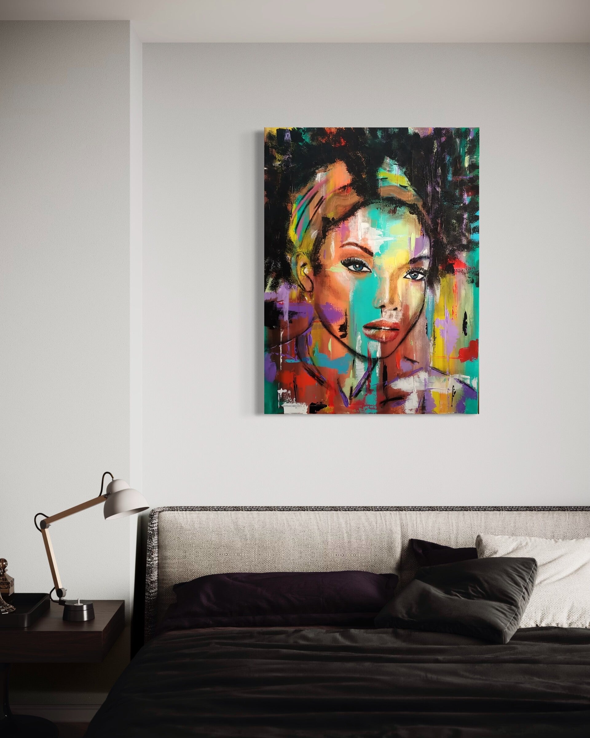 Los trazos audaces y las formas abstractas que envuelven a la figura crean una atmósfera de quietud y silencio. La mirada penetrante y enigmática de los ojos expresa una pausa ante el ruido exterior.
