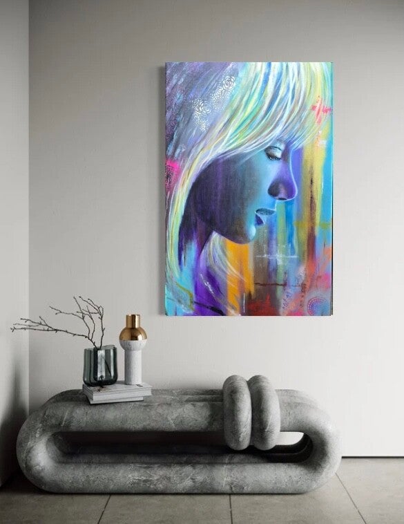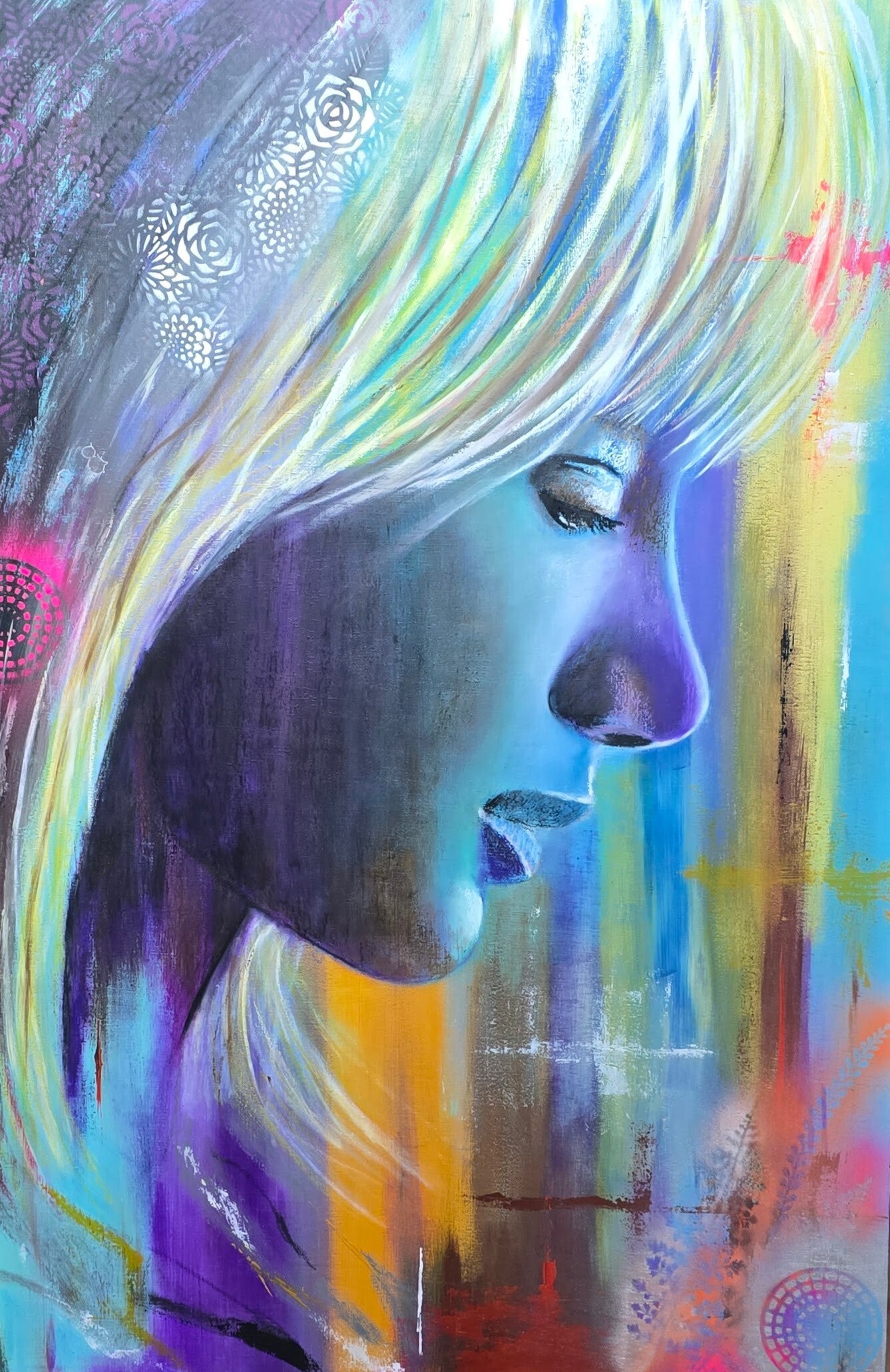 En el centro, destaca el perfil de una figura femenina de tono azul, que transmite una sensación de introspección y serenidad. Su expresión, con los ojos cerrados, parece sumida en un pensamiento profundo, en el recuerdo de algo perdido.
