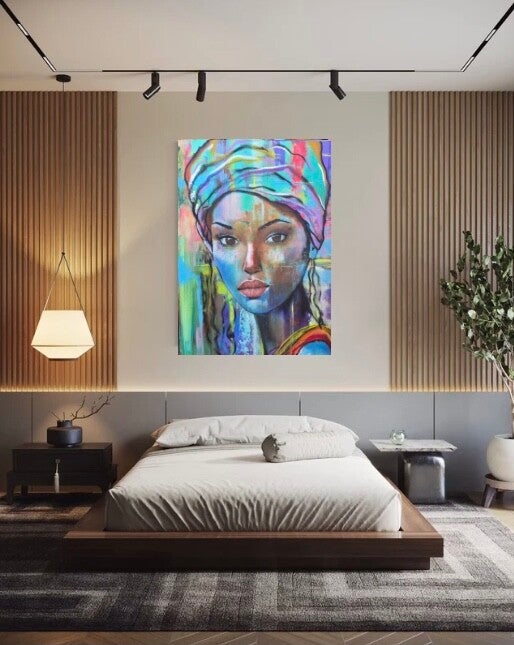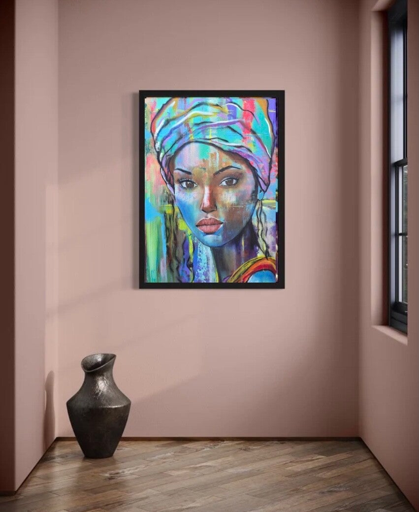El cuadro invita a un análisis profundo de su naturaleza vibrante y expresiva. La imagen central, un rostro femenino envuelto en una explosión de colores y texturas, parece cargada de complejidad emocional y simbólica.